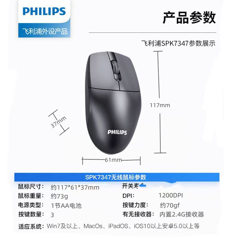 Philips/飞利浦SPK7347笔记本台式电脑2.4G无线鼠标 家用办公